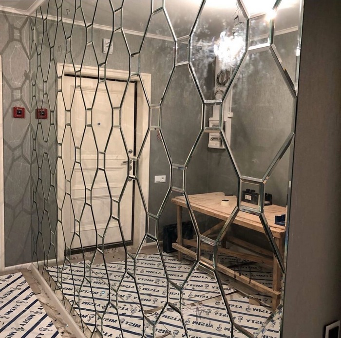 Посмотрите, как преобразилась мрачная прихожая благодаря зеркальному панно! Разумеется, пока что ремонт здесь не окончен, и голые стены и застеленные полы не дают возможности понять, как будет выглядеть интерьер в будущем. Но даже сейчас видно, насколько больше стало тут света.