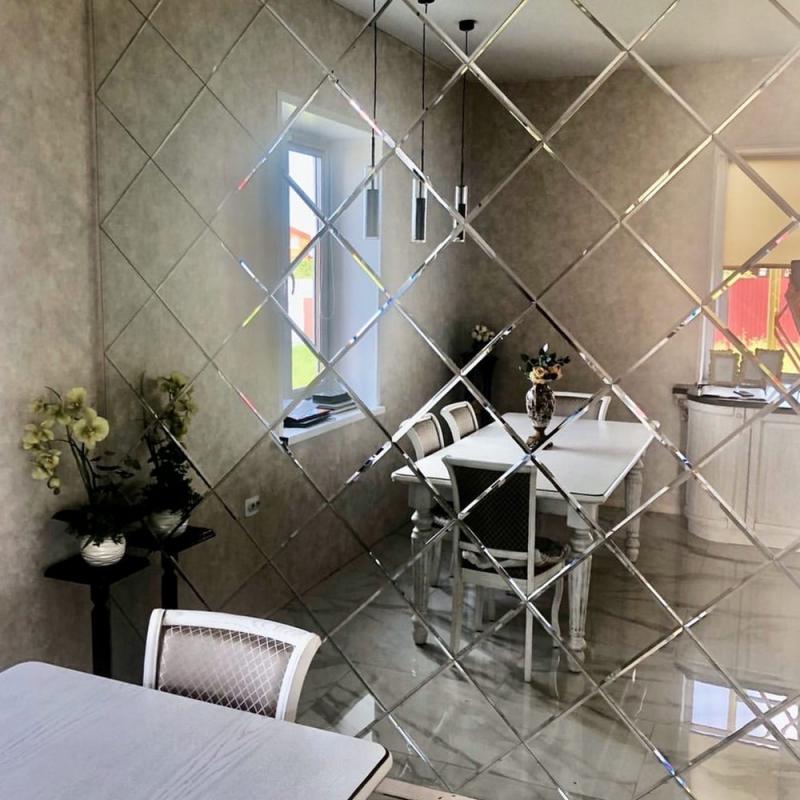 Использована серебряная глянцевая плитка квадратной формы, размером 18х18.
